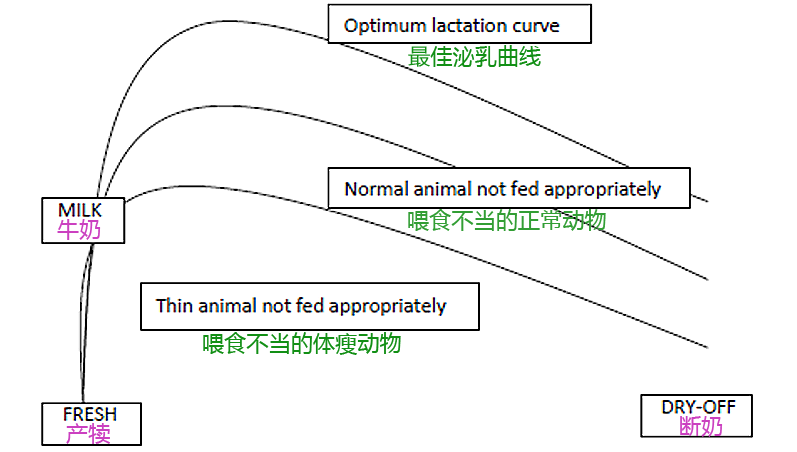 底下的曲線是產(chǎn)犢時(shí)體瘦的牛,她進(jìn)食不足無(wú)法保持體重,無(wú)法到達(dá)產(chǎn)奶高峰,從開(kāi)始產(chǎn)奶曲線就下滑。這樣的奶牛不但不給農(nóng)場(chǎng)產(chǎn)出利潤(rùn),還可能耗費(fèi)牧場(chǎng)的經(jīng)營(yíng)成本。但這不是她的問(wèn)題;是我們對(duì)她管理不當(dāng)。